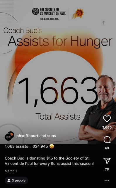 The “Assists for Hunger” graphic featuring Mike Budenholzer and the Phoenix Suns offers a clean, visually appealing presentation. It clearly communicates the basics: the Suns have totaled 1,663 assists, equating to a $24,945 donation to The Society of St. Vincent de Paul. The bold, centered typography and minimalistic layout make it instantly readable, even when quickly scrolling through a social feed. The visual simplicity is a strength, there’s no clutter, and the message is easy to grasp.